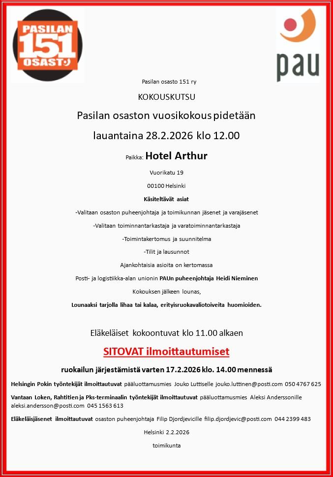 Posti- ja logistiikka-alan unioniin kuuluva Pasilan osasto 151 edustaa pääkaupunkiseudulla noin 2000 jäsentä.